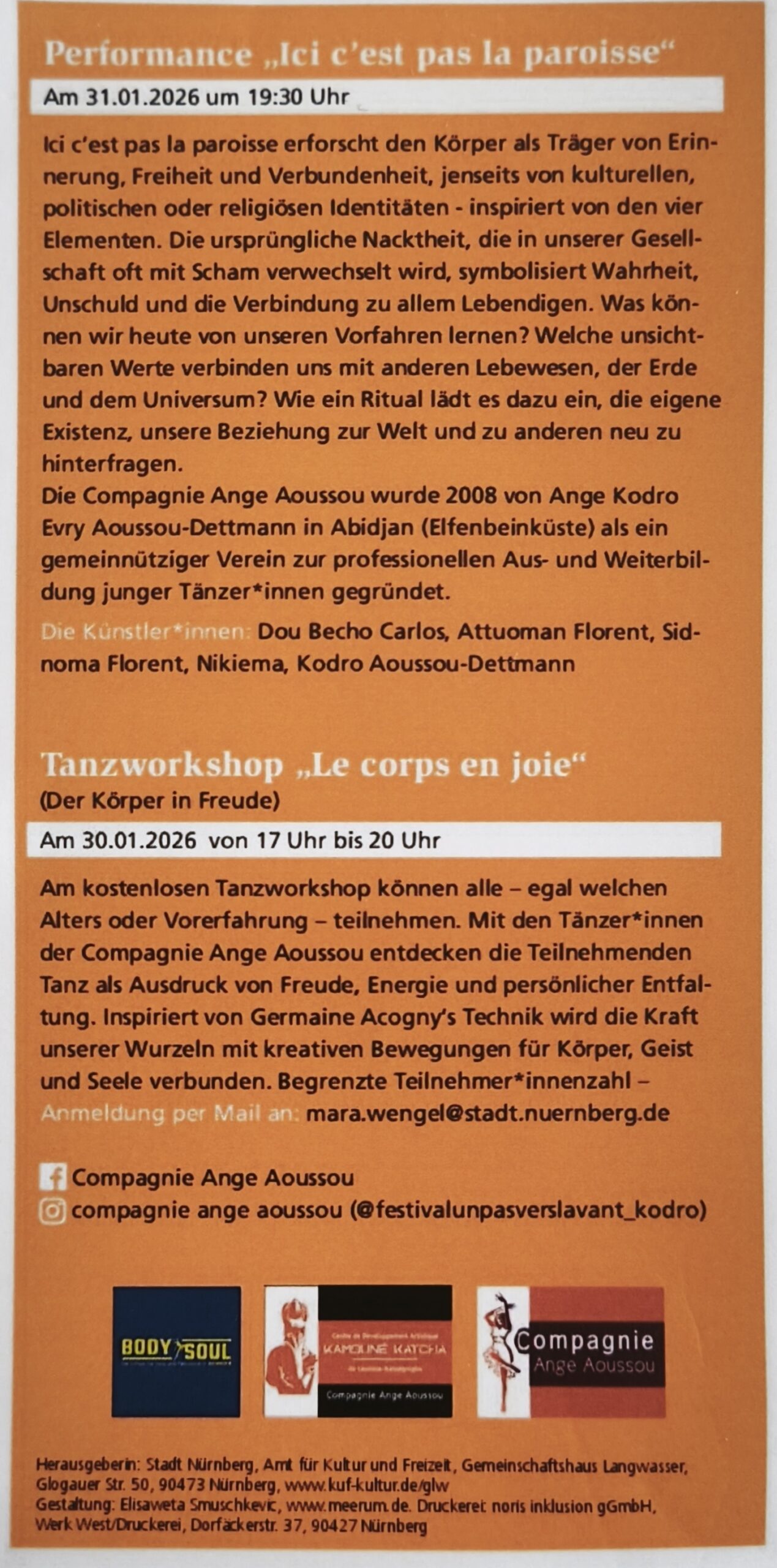 Die Tanzcompagnie Ange Aoussou und Marco Pigato freuen sich auf Ihr Kommen.