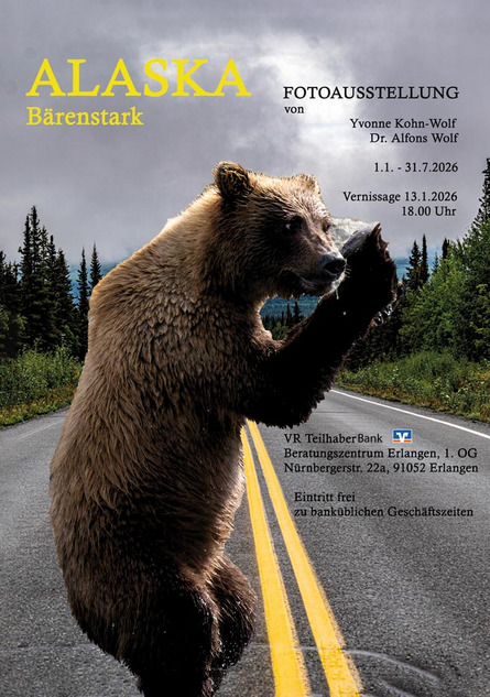 Zur Ausstellungseröffnung am Dienstag, dem 13.1.2026, um 18.00 Uhr, laden wir herzlich ein. Stoßen Sie mit uns an, lassen Sie sich von der Kraft Alaskas überraschen und genießen Sie einen bärenstarken Abend.