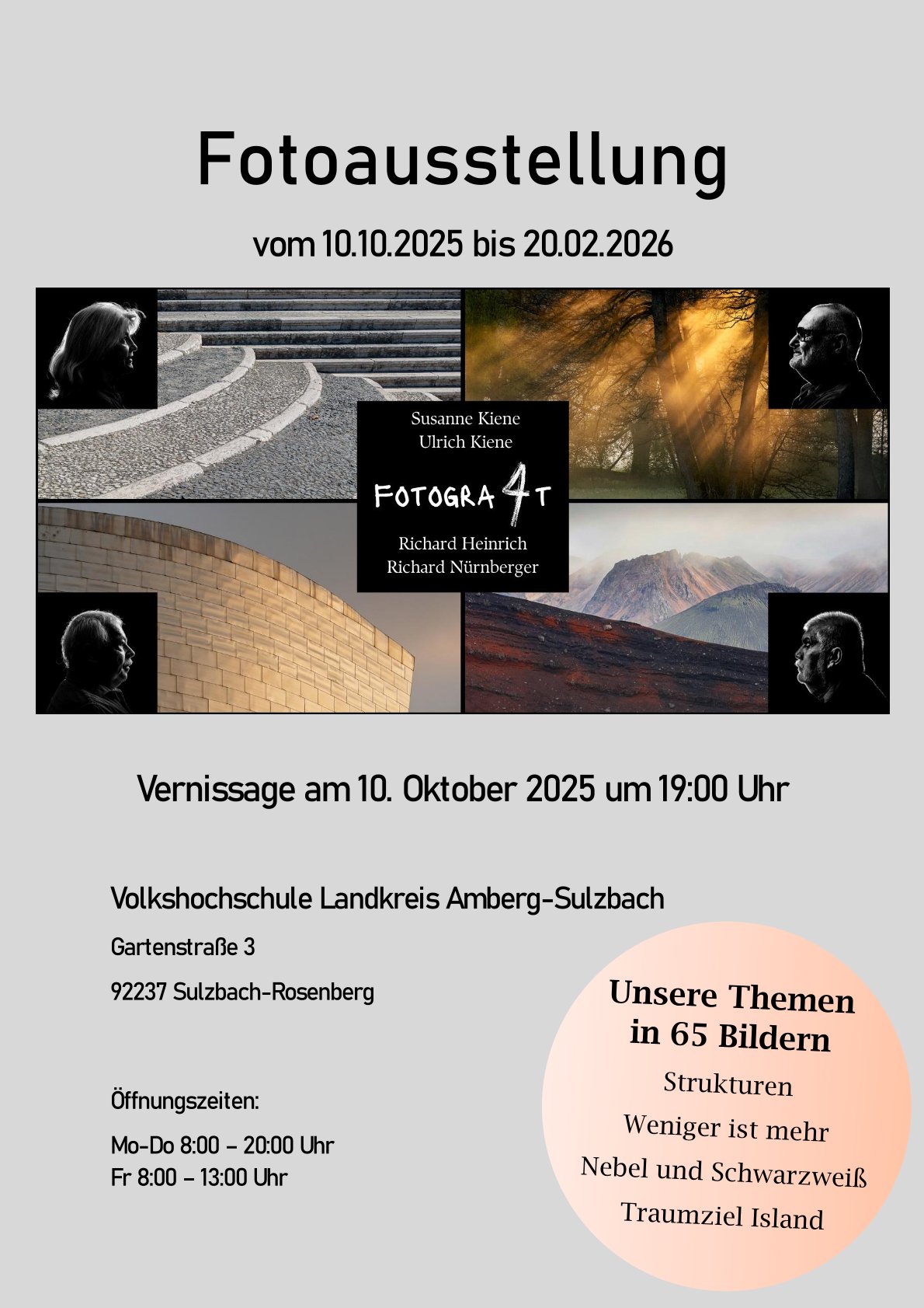 Die DVF-Fotografen Richard Nürnberger (Fotorebellen) und Ulrich Kiene (Nürnberger Photoclub) zeigen zusammen mit Susanne Kiene und Richard Heinrich eine Auswahl ihrer Fotos im großzügigen Atrium der Volkshochschule in Sulzbach-Rosenberg.
